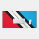 Este diseño moderno y deportivo presenta rayas de carreras en diagonal en blanco y negro con fondo rojo brillante y azul cielo.