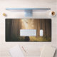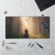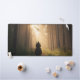 A cinematic desk mat featuring a lone rider traveling through a misty forest illuminated by warm golden sunlight. This atmospheric nature design adds adventure, depth, and calm woodland energy to any workspace.