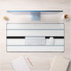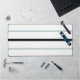 Este diseño deportivo y aerodinámico presenta una delgada franja central horizontal negra con pinstripes flotantes de pizarra delgada adyacentes contra un fondo blanco y nítido.
