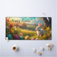 A picturesque spring landscape with rolling hills and blossoming trees stretches out in an idyllic, sunlit valley. A bright white Easter bunny sits attentively in the grass, surrounded by colorful, artfully decorated Easter eggs. The flowers in vibrant colors and the warm golden light of the setting sun lend the scene a peaceful and festive atmosphere. The elegant lettering "Happy Easter" hovers above the scene, underlining the festive mood.