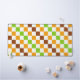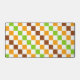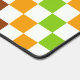 A vibrant checkered pattern of alternating green, orange, and brown squares on a white background. The design creates a lively, geometric feel.