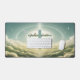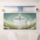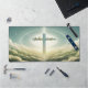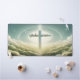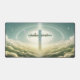 Cruz azul suave entre nubes esponjosas con diseño de tipografía.