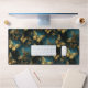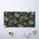 Una elegante alfombra de escritorio con un patrón de mariposas en brillantes tonos dorados y tonos azules brillantes.
