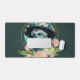 Mujer asombrosa adornada con un impresionante maquillaje de cráneo de azúcar. Los colores brillantes y los intrincados patrones cuentan historias de vida y muerte, dándole una mirada alegre y respetuosa que es perfecta para el Día de los Muertos. Su cabello largo y fluido resplandece un turquesa brillante que fluye sobre sus hombros como una cascada de color. Capta la luz y realza el ambiente festivo del diseño. El fondo brilla en tonos azules y verdes que recuerdan a un cielo nocturno, mientras que delicadas flores rosas y blancas bailan a su alrededor. Estos acentos florales no sólo agregan color, sino que también simbolizan el amor y el recuerdo de los fallecidos.
