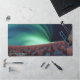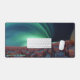 Una aurora, verde debido al oxígeno ionizado, aparece baja en el horizonte, una ciudad se sienta en primer plano. Personalizar agregando su propio texto.