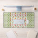 La alfombra de escritorio de inspiración retro caprichosa presenta pájaros rosas sobre ramas con flores amarillas rodeadas de un patrón de cuadrícula de puntos verdes