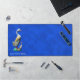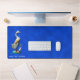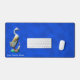 Un pato de madera tallada, pintado, con su pato, fuertemente curtido, sobre un fondo azul. Personalizar agregando su propio texto.