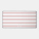 Esta alfombra de escritorio presenta un nombre blanco o un conjunto monograma de iniciales con un patrón clásico rayado de color rosa sobre blanco.