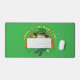 Mat de escritorio con un Ilustracion de un lindo leprechaun sonriente usando un traje verde, un sombrero top mientras sostiene una hoja de shamrock, con un arco iris colorido en el fondo y un texto que dice "Feliz Día de San Patricio" Un diseño perfecto para celebrar el Día de San Patricio, dibujado por Radka2D