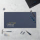 Minimalist simple elegant stylish premium look desk mat, customizable personalizable with monogram, initial letters and name, appropriate for a gentleman, Monochrome classy manly dusty navy blue background, elegant gold calligraphy script handwritten initial letters, and white serif typography for the name. Beautiful and timeless, for you or as a thoughtful custom useful electronic tech accessory gift for him. A best friend, a coworker, a boss, or someone from the family, a dad, a brother, even a grandfather will be very happy to receive this. For home, home office or business professional office space. for a man. Very affordable, a custom gift under 40 dollars to keep laptop, computer, keyboard and mouse protected and organized. Suitable for many occasions and celebrations, like birthday, Father’s Day, Christmas, graduation, retirement, anniversaries or just to make him a little surprise, without any special occasion.