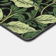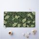 Una estampa de follaje con hojas de un verde claro casi oliva o salvia entrelazadas con verdes más oscuros. Un tono de verde cazador o un verde bosque oscuro crea la gran mayoría de las hojas. Todo esto sobre un fondo negro.