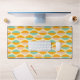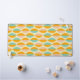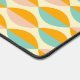 Repeating geometric pattern with overlapping leaf shapes in orange, teal, and pink on a beige background. The design conveys a retro, vibrant feel.