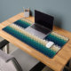 Esta alfombra de escritorio presenta un patrón geométrico compuesto de baldosas apiladas verticalmente en forma de rombo (rhombus) dispuestas en una rejilla repetitiva y sin costura. La paleta de colores progresa a través de suaves tonos de tierra (que van desde el beige cremoso hasta el azul verde azulado, verde, marino y profundo) que crean una onda hipnotizante o un efecto tipo montaña a través de la imagen. La interacción de los matices gradientes y la simetría da una sensación de ritmo y equilibrio visual.