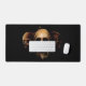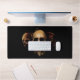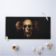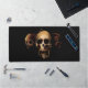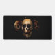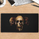 Tres calaveras humanas contra un fondo de negro. Un pequeño criador está asomando por el cráneo medio