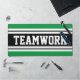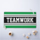 Este divertido diseño deportivo presenta texto atlético de TEAMWORK dentro de bandas de carreras de centro blanco y negro resaltadas contra rayas exteriores verdes brillantes. El texto se puede personalizar.