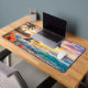 Desk mat featuring a fantasy painting of a dolphin on a tropical beach at sunset.