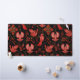 Vibrant red birds with detailed patterns are set against a black background, surrounded by intricate floral and leafy designs, creating a lively, ornamental scene.