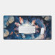 Dive into a serene workspace with this charming whimsical watercolor desk mat featuring an adorable spotted axolotl. The creature has a bright white body speckled with soft light blue accents and striking coral pink gills and ear tufts. It gazes happily out from the center of a deep blue pond, creating subtle water ripples that spread across the surface. Tiny orange-gold fish swim nearby, adding a pop of warm color to the cool aquatic scene. The setting is framed by large, muted blue and tan lily pads, capturing the tranquil beauty of a magical deep water environment. This artistic design brings a soothing and cute aesthetic to any area. This desk mat offers versatile use for various other businesses, events, or situations.