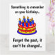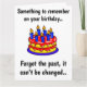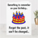 Algo que recordar en tu cumpleaños... Olvídate del pasado, no se puede cambiar... y olvídate del presente porque no te conseguí uno. Una tarjeta de cumpleaños divertida para tu novia, novio, amigo o familiar. Personalizar con tu texto, imagen o fondo.