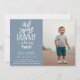 Agradable "un conejito" de la fiesta de cumpleaños con una invitación fotográfica de color azul polvoriento. Tipografía blanca con acento de oído conejito y soporte de patrón de tejido de cestería a mano.