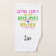 Muestra que las mujeres rompen el boliche usando este divertido y moderno diseño de boliche en una toalla de mano. Tiene la frase 'Algunos Chicas recién nacen con la pelota en sus almas' en tipografía rosa, dorada y verde. En el centro de la frase hay una bola de boliche azul rodeada de bolas rojas y blancas, La parte inferior tiene un nombre en tipografía de escritura negra que se puede editar para que te acomode. Todos los colores de este diseño son editables.