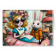 Collage de fantasía Alicia y el conejo blanco en un viaje flotante por un río con hongos creciendo a orillas