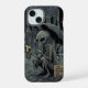 A lonely alien sits under a tattered umbrella in a dark city street, holding a cardboard sign that reads “Will Work for Planet.” Moody lighting, wet pavements, and glowing windows give it a haunting, sci-fi street-art feel.