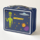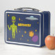 Crear un regalo personalizado fuera de este mundo. Esta lonchera presenta ilustraciones de un alienígena del espacio verde limón, un ufo o platillo volador, estrellas, una luna y planetas y está listo para ser personalizado con un nombre.