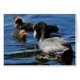Un lindo bebé eurasiático Coot mira esperanzadamente a uno de sus padres esperando que le den de comer. Tomada en el lago Roath Park, Cardiff, Gales.