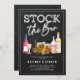Las parejas duchan invitaciones a fiestas de compromiso con un fondo de pizarra, una selección de cervezas y vinos de acuarela, el dicho "stock the bar" y una plantilla de texto moderna que es fácil de personalizar.