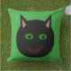 Esta impresionante almohada vibrante al aire libre cuenta con un gato negro con orejas puntiagudas, ojos verdes brillantes y una sonrisa roja astuta. Este gatito espeluznante es perfecto para Halloween o para los amantes de los gatos.