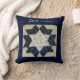 Una sección de un solo bloque de colcha. Texto "Amante de las Colchas" en letra cursiva blanca. Bloque: Patrón "Flor de estrella" acolchado en amarillo, blanco y azul oscuro. La "estrella" central es blanca con patos amarillos oscuros. Esto está rodeado de "pétalos" de azul oscuro con flores rojas, azules y amarillas. Alrededor de eso hay cuadros de cuadros amarillos y blancos. El fondo/parte posterior de la almohada es azul oscuro.