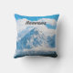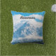 Almohada con imagen del cielo azul y texto, fuente Knewave y texto de color negro. El tipo de tela es para exteriores y el tamaño de la almohada es 16 x 16