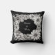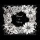 Una ilustración en blanco y negro presenta un marco floral que rodea los nombres "David & Mary". El marco está compuesto por varias flores y follaje, incluyendo margaritas y otras flores con detalles intrincados de pétalos y hojas. Las flores están dispuestas en un patrón circular, creando un efecto de corona alrededor de los nombres. Los nombres "David & Mary" están escritos en una fuente elegante y cursiva, centrada dentro del marco floral. El fondo es negro sólido, lo que hace que el marco floral blanco y el texto resalten. La ilustración está encerrada dentro de un borde cuadrado, lo que añade un elemento geométrico al diseño. El estilo de la ilustración es detallado y preciso, asemejándose a un dibujo a pluma y tinta.