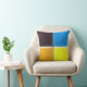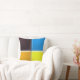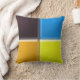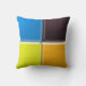 Cuadrados con un aspecto 3-D biselado, en naranja, amarillo, azul y negro, se unen en el centro de la almohada. El reverso muestra los mismos colores en posiciones alteradas para coincidir con los colores del frente en los lados.