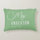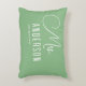 El diseño muestra una almohada elegante en verde salvia y blanco. Un hermoso texto único de "sra" en caligrafía caprichosa en la parte superior y un apellido y fecha personalizables en la parte inferior. El diseño es extremadamente único y clásico y será un artículo elegante para regalar a cualquier novia o recién casada como regalo
