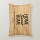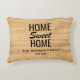 Una almohada tipográfica personalizada que presenta un fondo texturado de madera clara con la cita "Hogar dulce hogar". Añada el apellido de su familia a este producto para darle un toque personal.