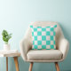 Una audaz almohada de cuadros turquesa y blanco con un estilo geométrico limpio. Perfecta para decoración moderna.