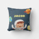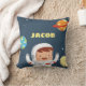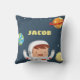 Un muchacho lindo del astronauta que flota en espacio exterior entre las estrellas y los planetas. ¡Esta almohada de tiro personlized es un gran pedazo decorativo para el niño pequeño que está encariñado con una aventura del espacio!