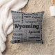 Una almohada de tiro encantadora que ofrece el estado de Wyoming y algo de sus ciudades de texto negro con las fuentes diversas y tamaños en un fondo gris en el frente, y negro en la parte posterior.