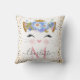 Almohada de monograma de princesa gatita de moda. Hermoso rostro de princesa gato en rosa oro, rosa claro y brillo dorado, nariz en forma de corazón rosa y pestañas negras grandes, con una corona y arreglo floral azul, tonos rosados y dorados. En los lados, confeti rosa dorado falso brillante. Fácilmente personalizable y agregar su nombre y monograma para personalizar la almohada.
