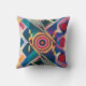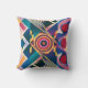 Una imagen vibrante y cautivadora que muestra una impresionante almohada de lanzamiento de patrón geométrico moderno. El patrón consiste en varias formas en colores audaces y contrastantes, incluyendo triángulos, cuadrados y formas circulares. El diseño es simétrico pero dinámico, con un sentido de movimiento fluido.