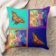 Mi pintura original del color de agua imprimió en un Cojín decorativo que ofrecía cuatro cuadrados del color con un swallowtail grande en dos de los cuadrados, y un cielo abstracto colorido con dos mariposas del swallowtail y una mariposa de monarca que agitaba alrededor de las flores rosadas del iris en los otros dos cuadrados. En la parte posterior es una ampliación de foto de la pintura de la atracción de Swallowtail.