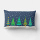 Un diseño geométrico moderno de cinco abetos en trullo, turquesa y amarillo de oro. El cielo es marina de guerra con la nieve que cae blanca.