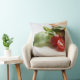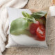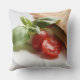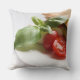 Almohada de tiro con la comida italiana sana que consiste en un bocadillo del panini y un tomate, hojas verdes de la albahaca y un queso de la mozzarella en un fondo blanco.