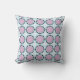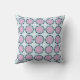 Una almohada decorativa con un patrón geométrico simétrico con tonos azules, blancos y marrones mostrados desde el frente y la parte posterior sobre un fondo gris.