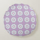Una almohada decorativa con un patrón geométrico simétrico con tonos azules, blancos y marrones mostrados desde el frente y la parte posterior sobre un fondo gris.