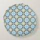 Una almohada decorativa con un patrón geométrico simétrico en tonos azules, blancos y marrones mostrada desde el frente y la parte posterior sobre un fondo gris.