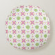 Una almohada decorativa con un patrón geométrico simétrico con tonos azules, blancos y marrones mostrados desde el frente y la parte posterior sobre un fondo gris.