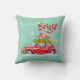 almohada decorativa para Feliz Navidad, con un lindo ilustracion de un auto decorado festivamente con ramas de abeto y cajas con regalos en el techo.